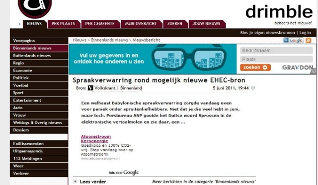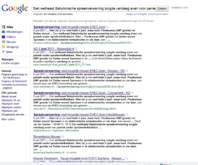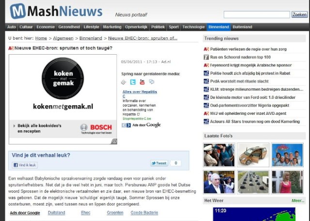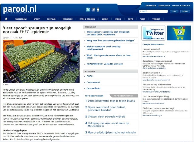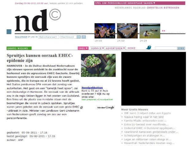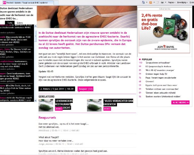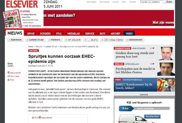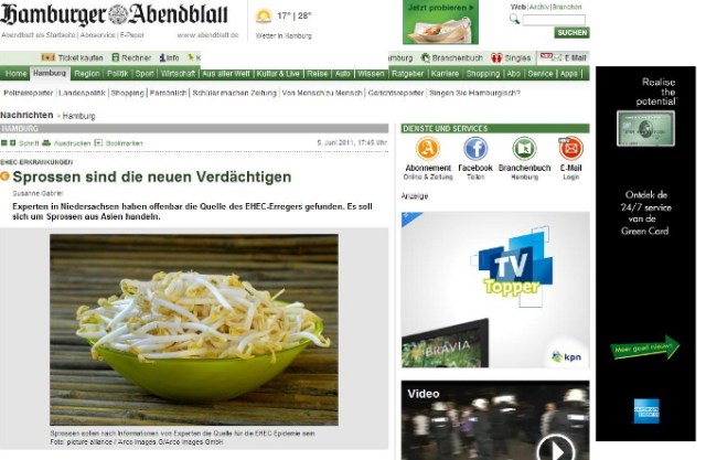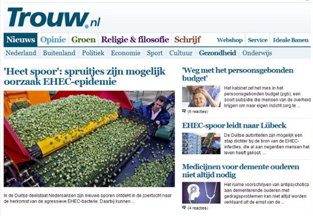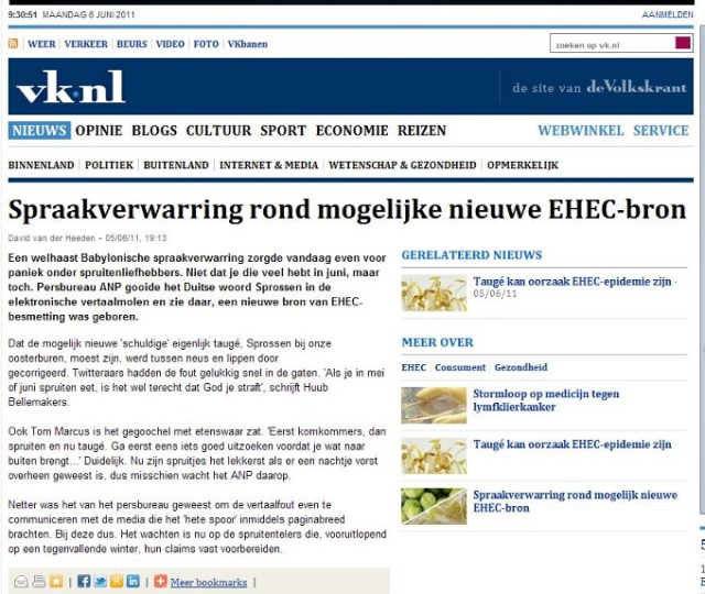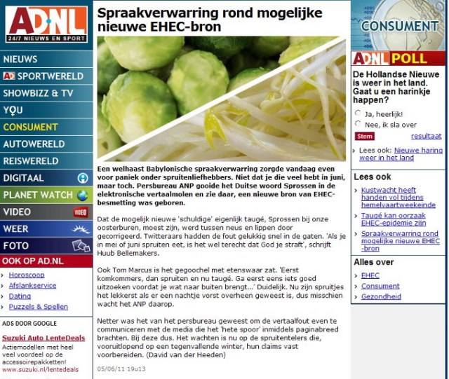 Over de media. Persbureau ANP neemt een bericht van haar Duitse collega DPA over (05.06.2011) en vertaald het woord ‘Sprossen’ in spruiten, zoekt een foto in het archief waar spruitjes op staan en binnen korte tijd nemen bijna alle media dit over. Niet alleen alle gevestigde kranten, uitgezonderd de NRC (de NRC heeft persbureau ANP in 2010 opgezegd en betrekt het nieuws sinds dit jaar van Novum Nieuws persbureau) maar ook alle zich nieuwswebsites noemende websites die met het doorlinken en kopiëren van berichten en een paar Google advertenties hun bestaan verdienen, nemen berichten over zonder enige verificatie. Na enige tijd wordt de fout ontdekt dat Sprossen taugé is en bijna alle media plaatsen nu een bericht met een correctie. Wat hierbij opvalt is dat het bericht van een en dezelfde auteur ook door alle media letterlijk wordt overgenomen.