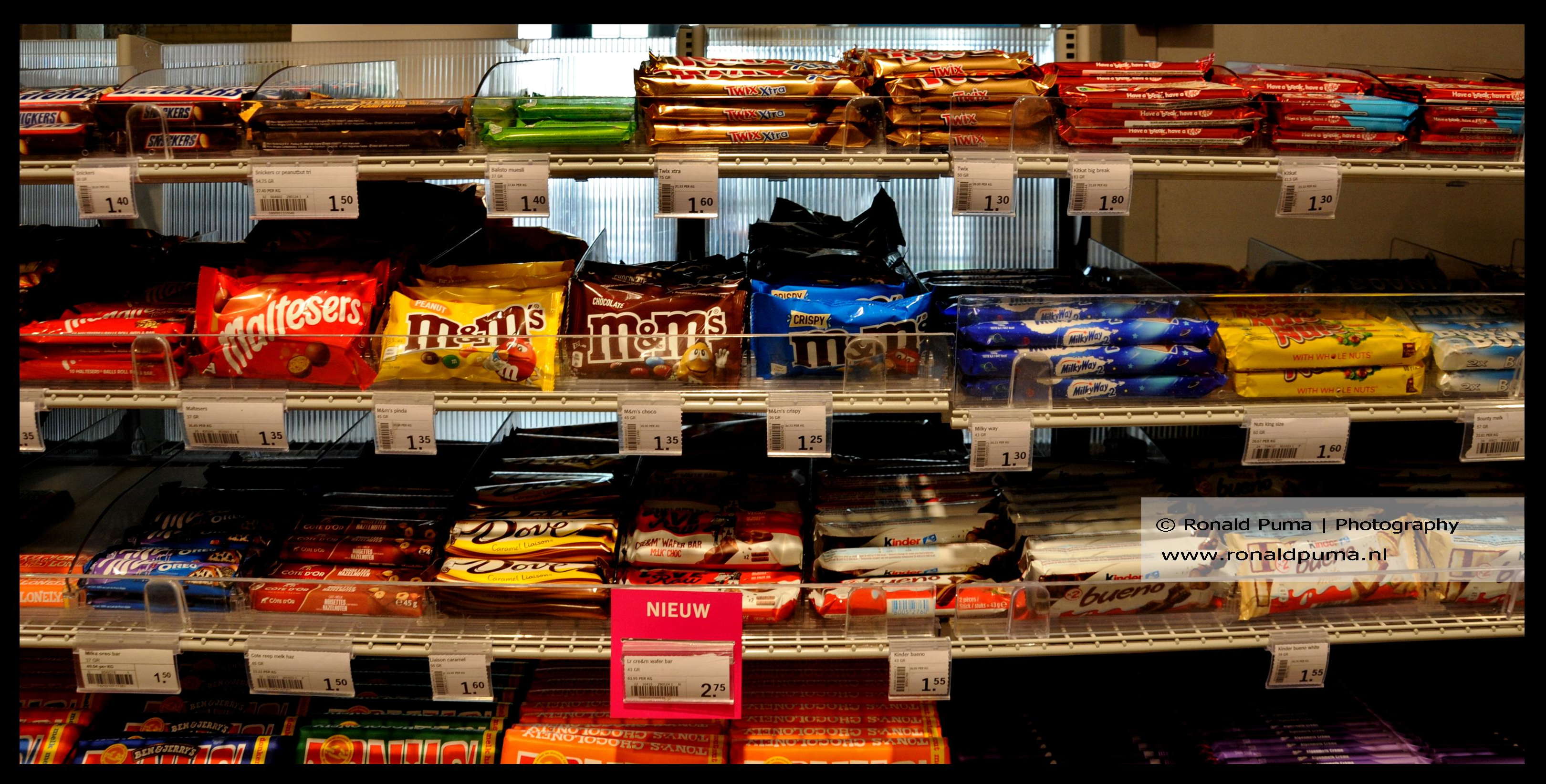 De behoeft aan suiker, zout en vet zit in het oerbrein van de mens. Het zijn de extremen van voeding (in de mond) en angst voor honger doet telkens eten. In de rijke westerse wereld wordt voedsel overal aangeboden en dat vraagt om zelfbeheersing. Aangezien dit moeilijk is en op iedere straathoek iets te eten is is de helft van de mensen TE DIK en als er op jonge leeftijd mee begonnen wordt kan obesitas ontstaan (dit gaat dus niet over mensen met een stofwisselingsprobleem). In Nederland heeft een benzinetankstation meer omzet door snoep, snacks en rookwaar (wordt wel minder) dan benzine. Bij iedere supermarkt ligt snoep bij de kassa voor de impulsaankoop, even snel een chocoladereep erbij leggen. Op stations staan snoepautomaten (zie foto). In de Verenigde Staten ziet men dat er niet een bekertje frisdrank wordt geserveerd (bij een broodje hamburger) maar een halve liter, dus een halve liter suiker (over het verwerpelijke dominante globale kapitalisme van Amerikaans fastfood schreef ik in Dossier Amerika (VS)). Armoede en ongezond eten zijn in verband met elkaar, weinig geld hebben zorgt voor goedkoop eten kopen (kiloknallers ed). Dit zijn ook de mensen die minder oud worden zo is uit onderzoeken gebleken.