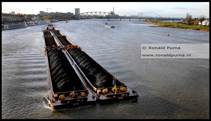 Schip met kolen op de Waal op weg van Rotterdam naar Duitsland.